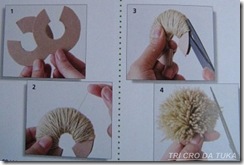 Espero que com as figuras abaixo dê para se entender como se faz um pompom e os efeitos que ocêis podem conseguir colocando fios de cores variadas.