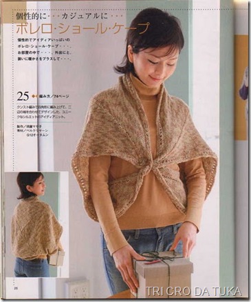 Esse pelerine em tricô é feito com um só quadrado. O modo como se fecha é que dá este visual diferente…